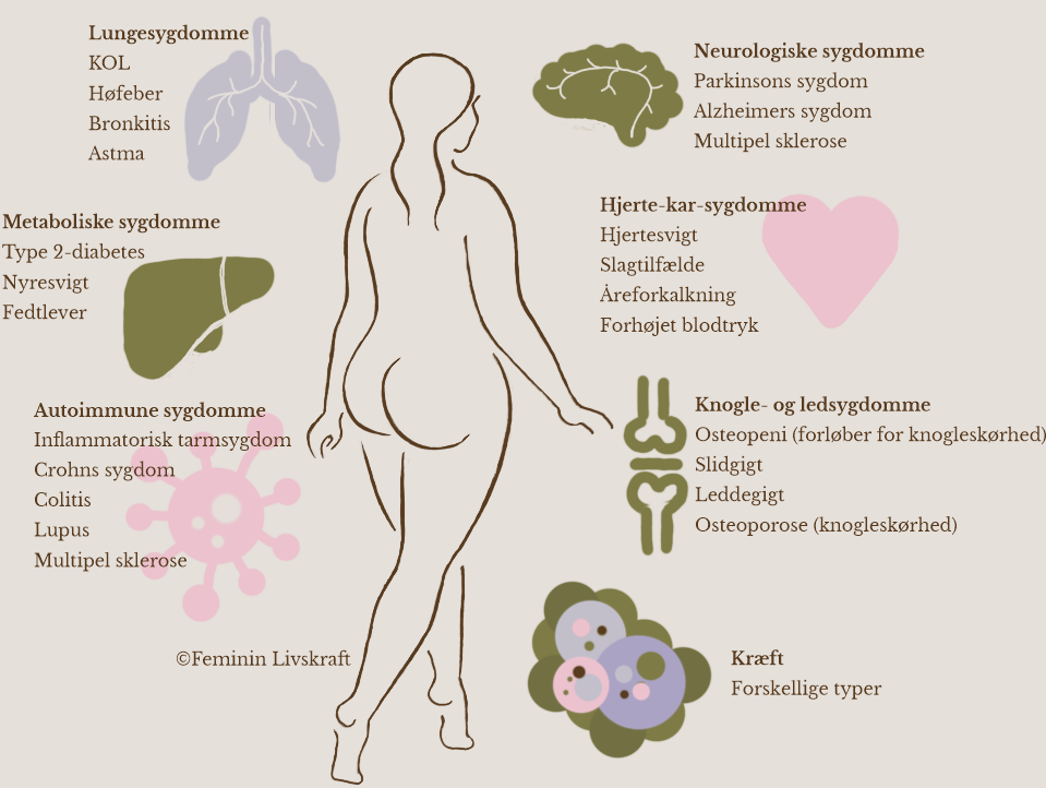 Efter menopaus falder niveauet af østradiol, progesteron og testosteron. Dette får immunforsvaret til at ændre sig, fra at undertrykke inflammation til at fremme den i stedet. Resultatet er lavgradig, kronisk inflammation, der accelererer aldring og øger risikoen for flere sygdomme, såsom hjerte-kar-sygdomme, osteoporose, type 2-diabetes, demens, autoimmune sygdomme og kræft.
